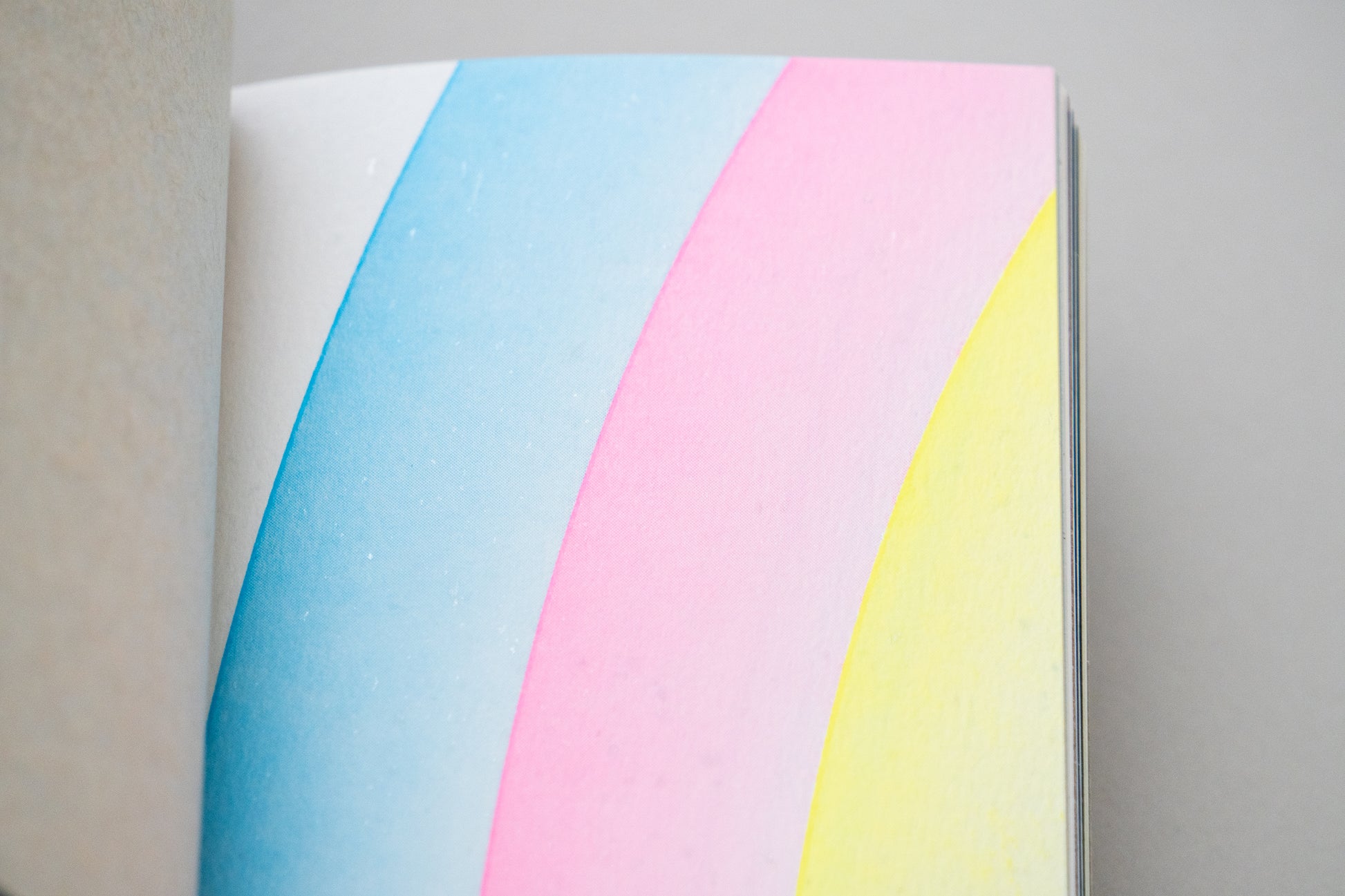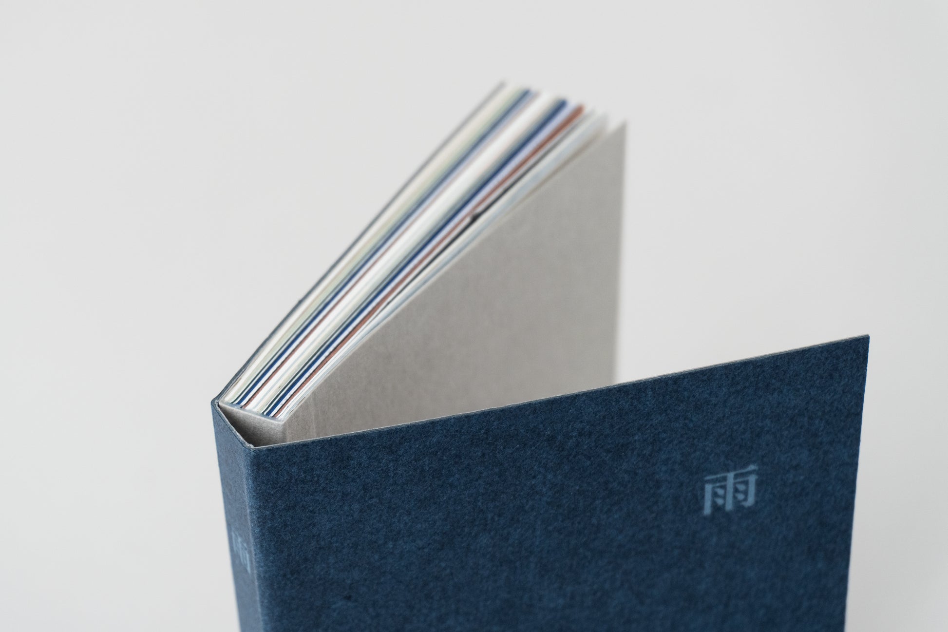 “雨”から連想されるモチーフや心情、風景などをシンプルに描いたグラフィックを、紙の種類と活版印刷技術のバリエーションで質感豊かに表現した一冊です。小さな物語が宿るようなシーンの一つひとつを、片背開きの製本様式で仕上げた特製の「豆本」(=手のひらにおさまる小型の書籍)として、身近にお楽しみいただけます。