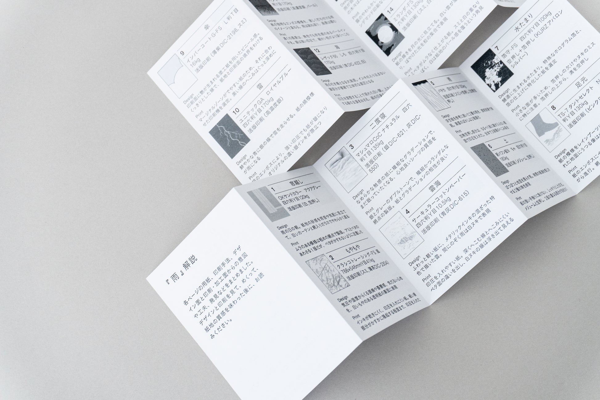“雨”のグラフィックを18ページ、印刷を施していない同じ種類の紙を18ページ配して構成。さらに各シーンの印刷手法とデザイン・印刷加工の意図や工夫をまとめた蛇腹折りの解説紙を添付しています。豆本『雨』とともにお手元に保管いただき、創作・表現の手がかりとして、紙や印刷手法の参考資料にお役立てください。